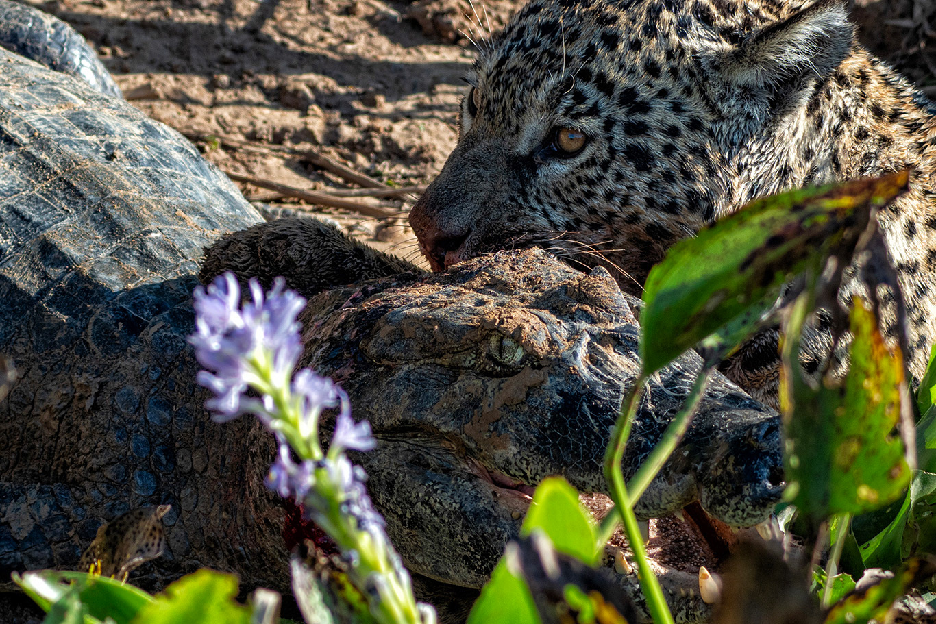 Sur les rives du fleuve, un jaguar vient de capturer un caïman